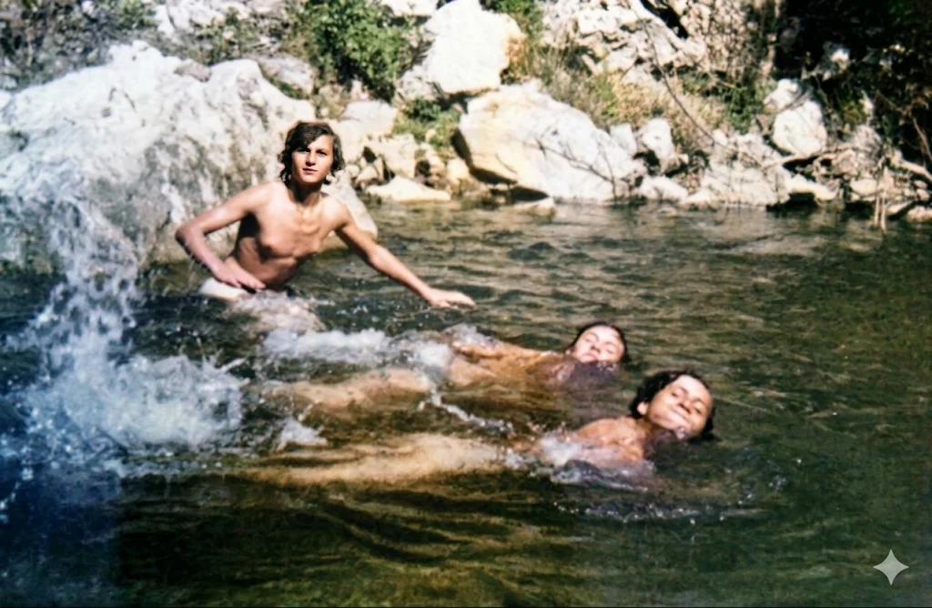 1975: νεαροί κολυμβητές στα κρύα νερά του Μόρνου στη θέση Στενό!