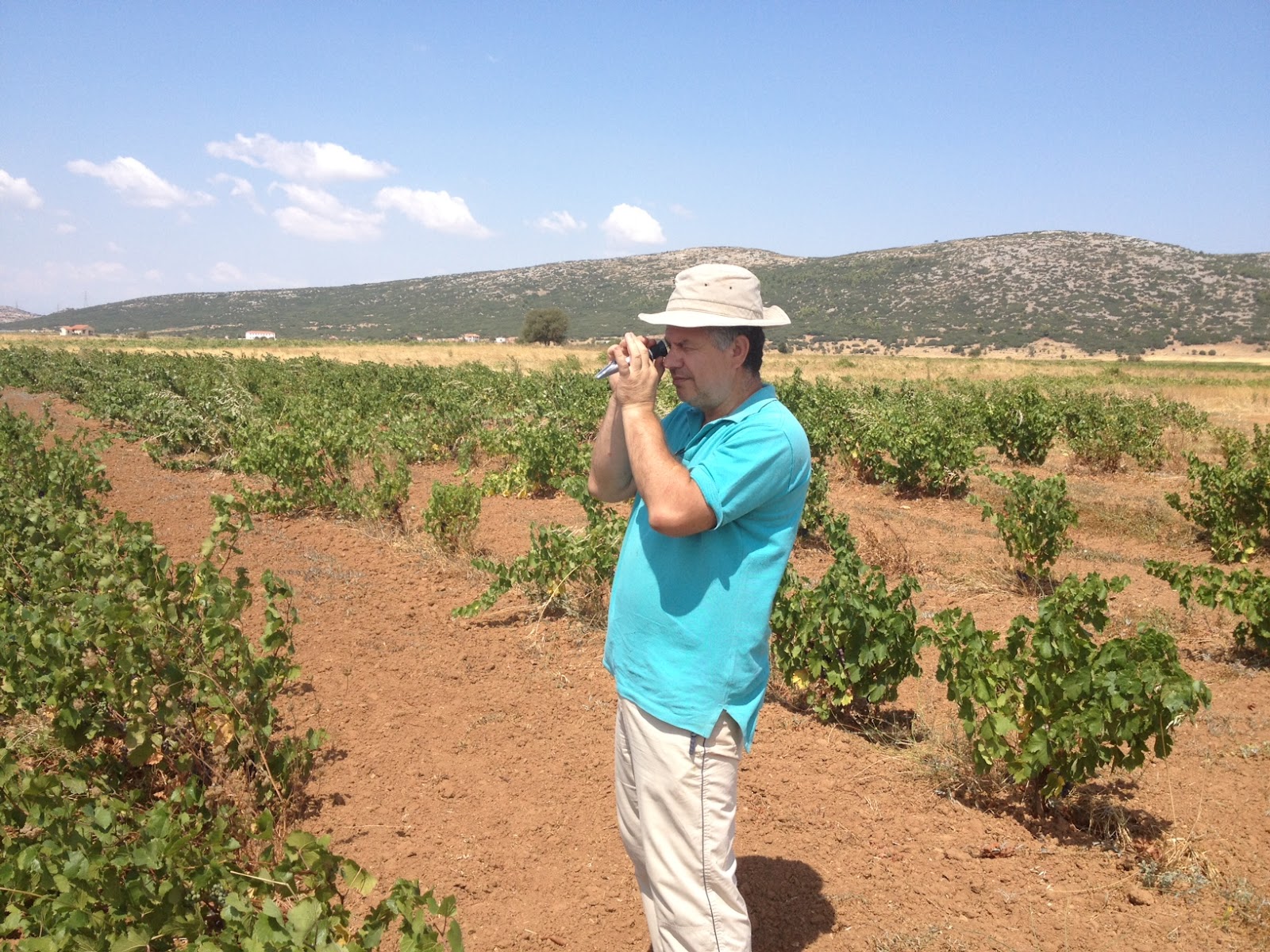 ειδικός επιστήμων σε θέματα ωρίμανσης σταφυλιών εξετάζει με όργανα υψηλής τεχνολογίας την ποιότητα και την εξέλιξη της ωρίμανσης στην θέση παλιάμπελα στο οροπέδιο των ΣΚΟΥΡΤΩΝ στον αμπελώνα ΣΠΥΡΟΥ Ν ΓΚΙΚΑ