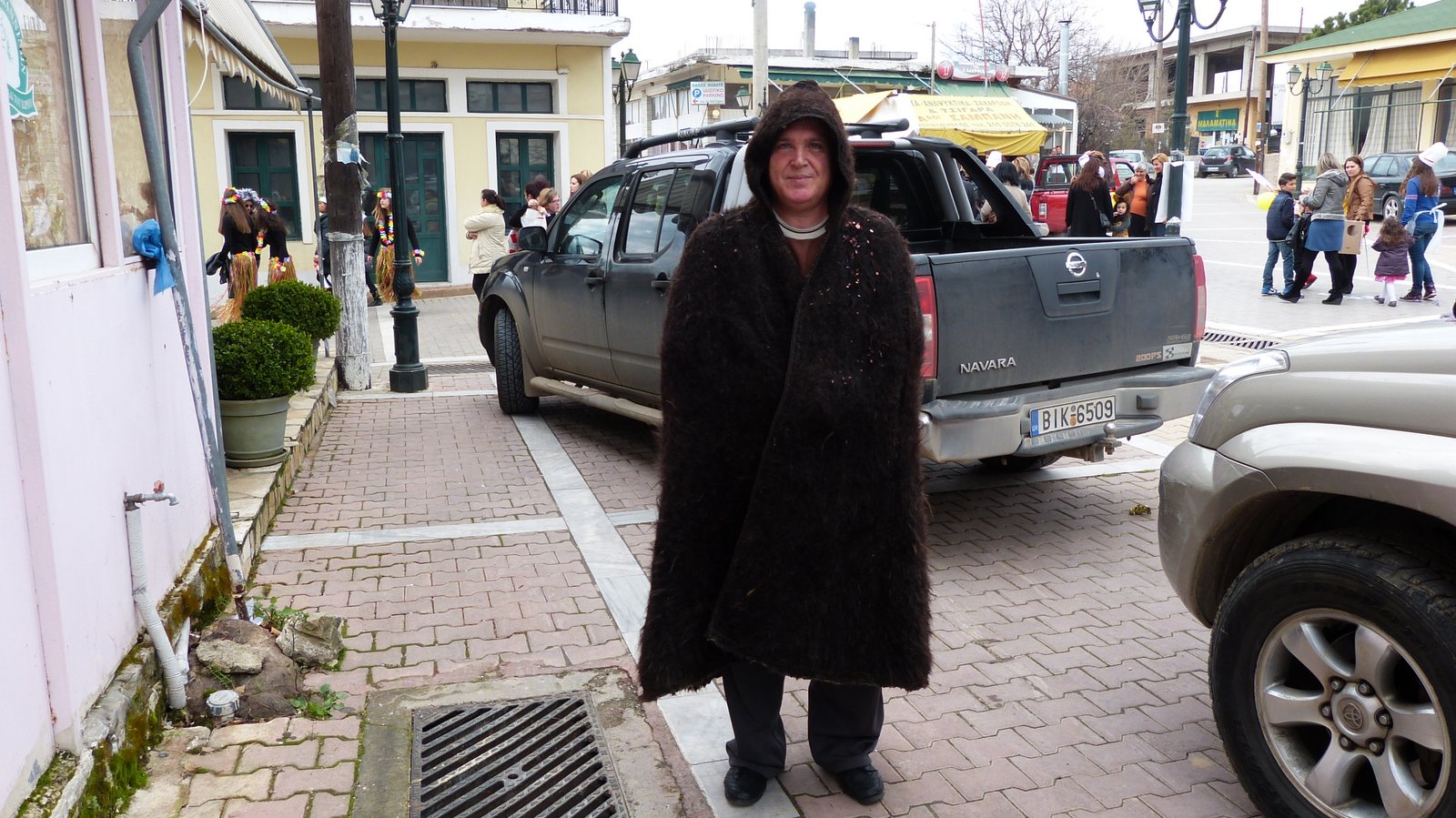 ο Δημήτρης Καλμπένης με κάπα βοσκού στην πλατεία Α Σκουρτανιωτή στα Σκούρτα .