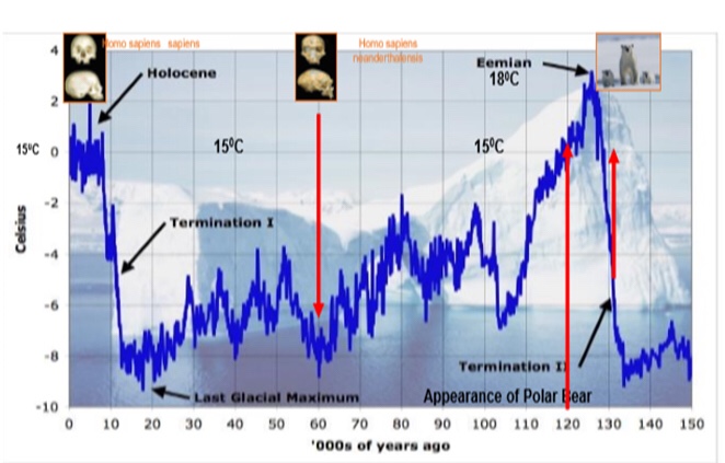 Πριν 14.000 χρόνια, η μέση γήινη θερμοκρασία στον πλανήτη ανέβηκε από 11 βαθμούς Κελσίου στους 15 βαθμούς χωρίς να γνωρίζουμε την αιτία (εικόνα 8). Μεταξύ 8.500 π.Χ. και 4.500 π.Χ., ήτοι κατά την παλαιολιθική περίοδο, η μέση γήινη θερμοκρασία ανέβηκε στους 17 βαθμούς Κελσίου. Αυτή την εποχή, που ονομάζεται η περίοδος του Ολοκαινικού μεγίστου, δημιουργήθηκε η Σαχάρα χωρίς να εξαφανιστούν ούτε οι πάγοι από τον Βόρειο και Νότιο Πόλο, ούτε οι αρκούδες και ούτε οι πιγκουίνοι.