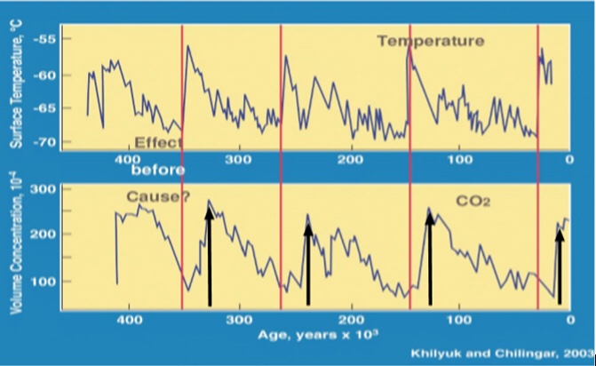 Εικόνα 7. Υστέρηση μεταξύ της εμφάνισης της μέσης γήινης θερμοκρασίας και της περιεκτικότητας της γήινης ατμόσφαιρας σε CO2 κατά τον Φανεροζωϊκό Αιώνα Αυτή η διαχρονική παρατήρηση μας λέει ότι η περιεκτικότητα του ατμοσφαιρικού CO2 είναι το αιτιατό και όχι η αιτία της ανόδου της γήινης θερμοκρασίας, Khilyuk and Chillingar, 2003.