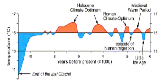 Εικόνα 8. Οι διακυμάνσεις της μέσης γήινης θερμοκρασίας τα τελευταία 11000 χρόνια, Dansgard et al., 1969 και Shonwiese 1995.