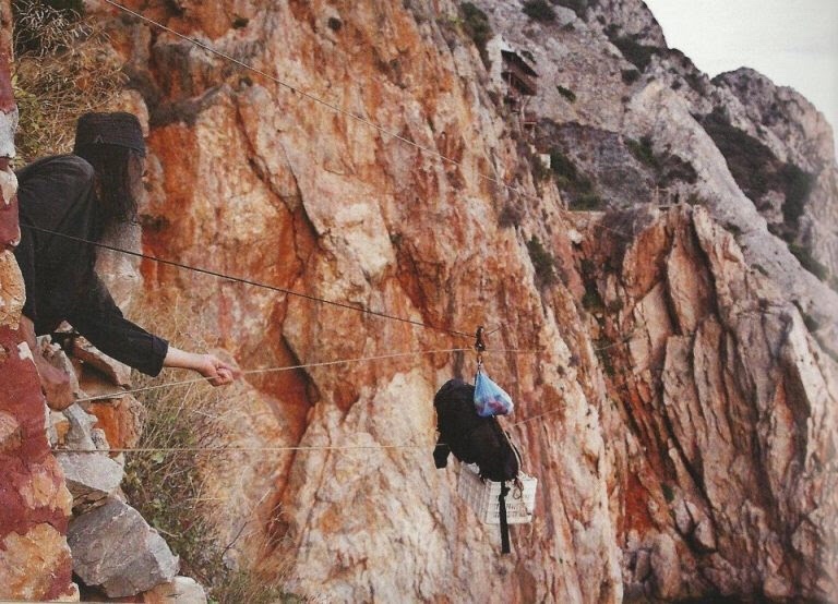 Οι ξύλινες σκάλες που είναι καρφωμένες στα βράχια, χρησιμεύουν στους ερημίτες για να ανέβουν και να κατέβουν το βουνό. Μερικοί από αυτούς τους μοναχούς, ειδικά εκείνοι που είναι γέροι και αδύναμοι, δεν έχουν εγκαταλείψει το βουνό εδώ και 60 χρόνια!