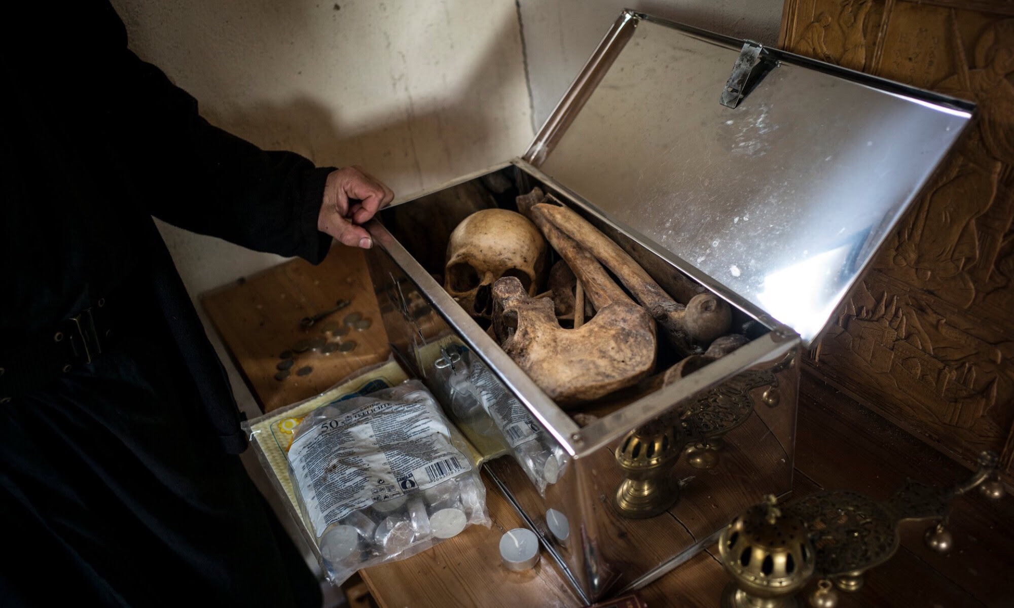 Τα οστά του μοναχού που κατοικούσε σε αυτό το κελί φυλάσσονται σε ασημένιο κουτί. Συνηθίζεται, ο μοναχός ακόμη και μετά τον θάνατο του να παραμένει στον χώρο που έζησε. Αυτή η ζωή είναι ένα χαστούκι στον δικό μας σύγχρονο τρόπο ζωής.