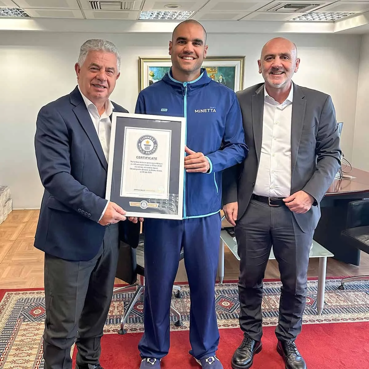 Τον αθλητή υποδέχθηκαν ο Εκτελεστικός Αντιπρόεδρος του Διοικητικού Συμβουλίου της ΜΙΝΕΤΤΑ Ασφαλιστικής Κώστας Μπερτσιάς, καθώς και ο Διευθυντής Μάρκετινγκ και Επικοινωνίας της εταιρείας Νίκος Μόσχοβος, οι οποίοι συνεχάρησαν θερμά τον πρωταθλητή για την εξαιρετική του επίδοση και επανέλαβαν τη δέσμευση της εταιρείας να στηρίζει έμπρακτα ανθρώπους που αποτελούν πρότυπα δύναμης και επιμονής.
