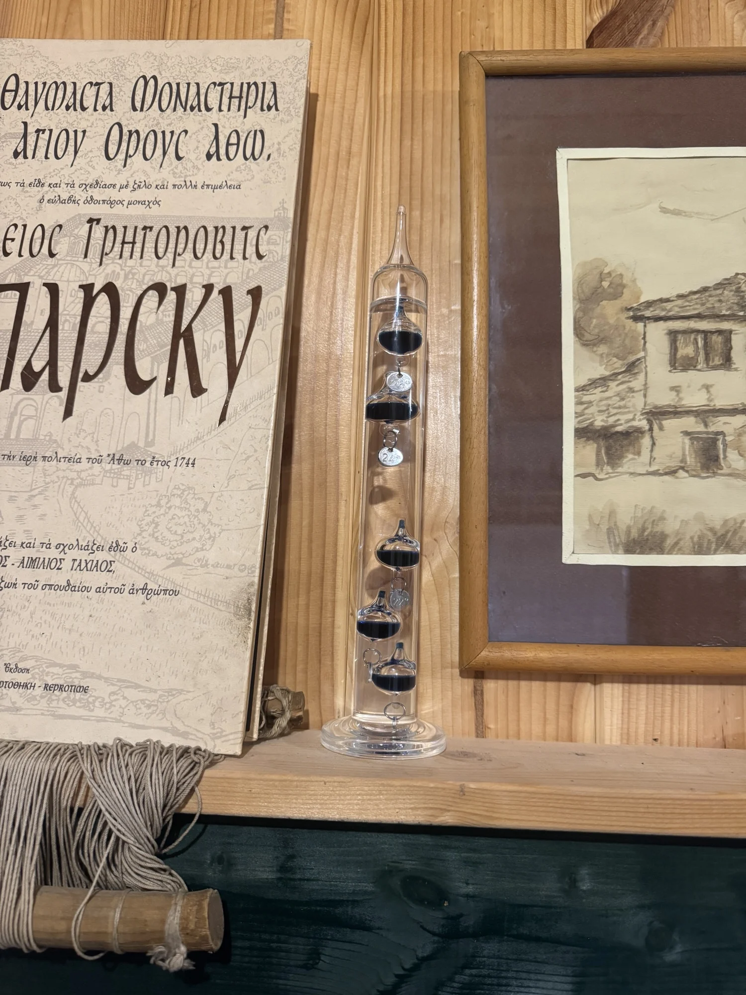 Στο ράφι, ανάμεσα σε παλιά βιβλία και ξύλινες επιφάνειες που κουβαλούν τον δικό τους χρόνο, στέκει ένα θερμόμετρο Γαλιλαίου. Μου το χάρισε ο Βασίλης ένας παλιός φίλος, αξέχαστος πλέον, πολλά χρόνια πριν.