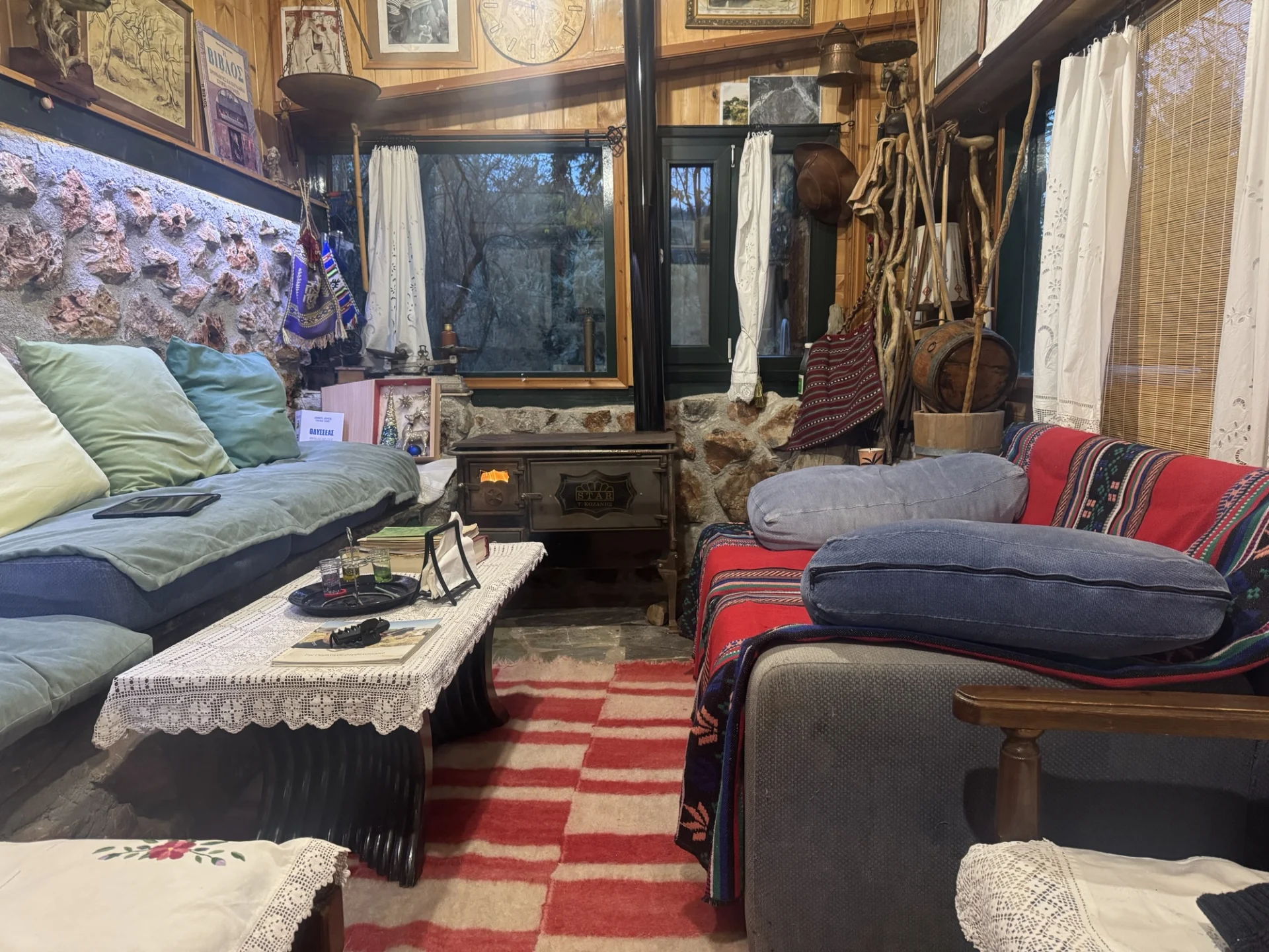 Η θαλπωρή της φωτιάς από την παλιά μασίνα αγκαλιάζει το αρχονταρίκι, που μετουσιώνεται σε ιδανικό καταφύγιο χαλάρωσης, διαβάσματος και έμπνευσης.