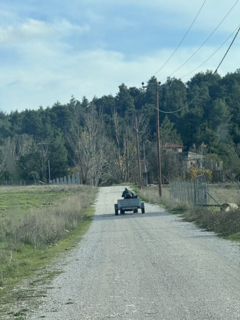 με βόδια αργοκίνητα τραβάει προς την Πύλη.